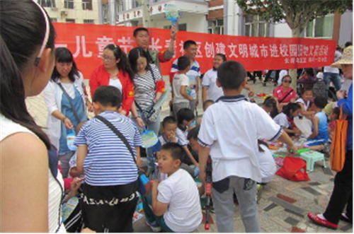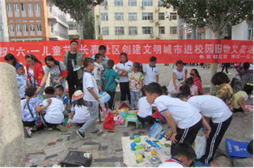 长青社区庆六一创城宣传进校园旧物义卖活动长青社区于2016年5月30日组织志愿者长青社区庆六一创城宣传进校园旧物义卖活动。利用海区一小跳蚤市场活动契机,长青社区组织辖区志愿者和孩子们拿出家中闲置的物品进行义卖。为丰富活动内容活动中志愿者向在校园爱心捐款树献爱心的孩子们,发放了宣传青少年健康教育手册、反邪教等创城宣传品、知识手册。参加活动的志愿者和孩子们表示参加这样的活动很有意义,不仅让家中闲置的物品得以循环利用,还锻炼了自己,让孩子们知道了家长挣钱不容易。有些孩子还因为自己的善举拿到了创城的小扇子、纸巾等小纪念品。图为长青社区旧物义卖活动现场照片。