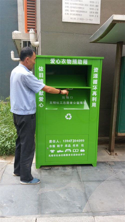 墨香梨园社区亿信国际小区有处铁片做的‘绿房子’,这个‘绿房子’占地约1平米、高约2米,专门用来投放旧衣的,房子上部有衣物投放口,下部则可以开箱取出衣物。”8月23日,由乌海市社会志愿服务交流协会为墨香梨园社区亿信国际小区等8个小区安置了“爱心衣物捐助箱”